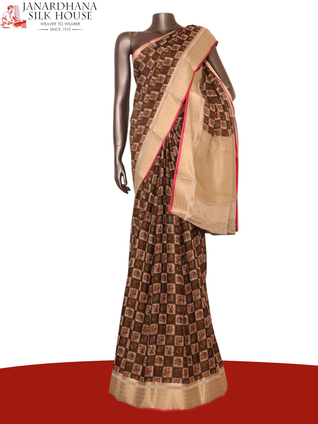 Perfect For A Party Wear or Festive. Finest Quality 80-90gms Pure Crepe Silk Saree In Exclusive Floral Prints All Over With Contrast Zari Border,Contrast Zari Pallu.Also With A Attach 0.8mts Silk Blouse.