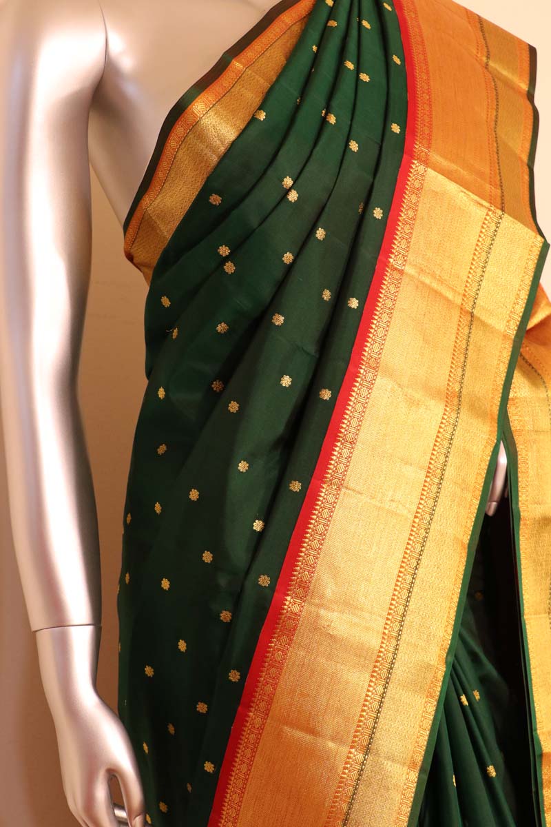 Janardhana Special. Handloom Pure Kanchipuram Silk Saree In Classic Zari Buttas & A Grand Zari Border,Rich Contrast Zari Pallu.