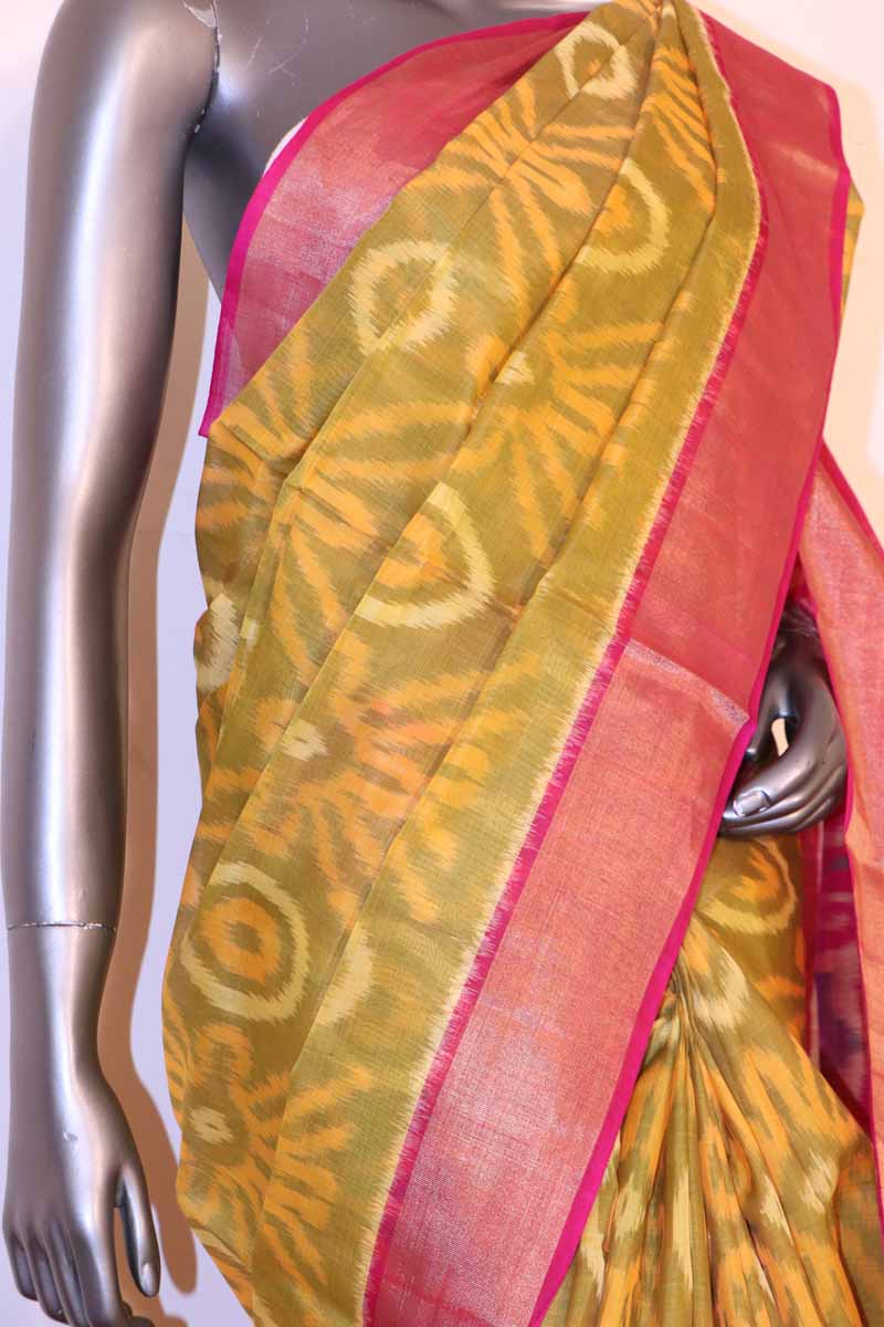 Perfect For A Wedding or Party Wear.Handloom Pochampally Silk Cotton Saree Is Classic Pochampally Ikat Weave & A Traditional Zari Border.A Contrast Pochampally Ikat Pallu & With A Attached 0.8mts Blouse With Border.